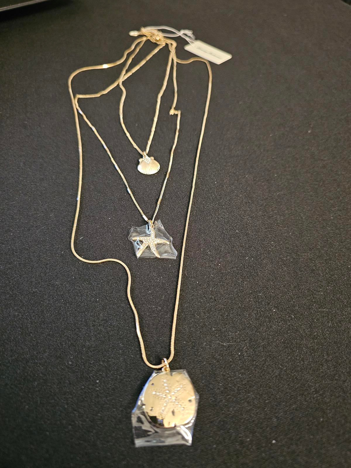 Dive into style with this stunning layered necklace set featuring delicate designs of starfish and shells. Crafted with fine attention to detail, this jewelry piece is perfect for beach lovers and those who appreciate unique accessories.\n- Three adjustable layers provide versatility in styling\n- Includes charming starfish and shell pendants\n- Durable gold-tone chains for enhanced elegance\n- Ideal for casual outfits or special occasions\n- Perfect gift for ocean enthusiasts or fashionista friends