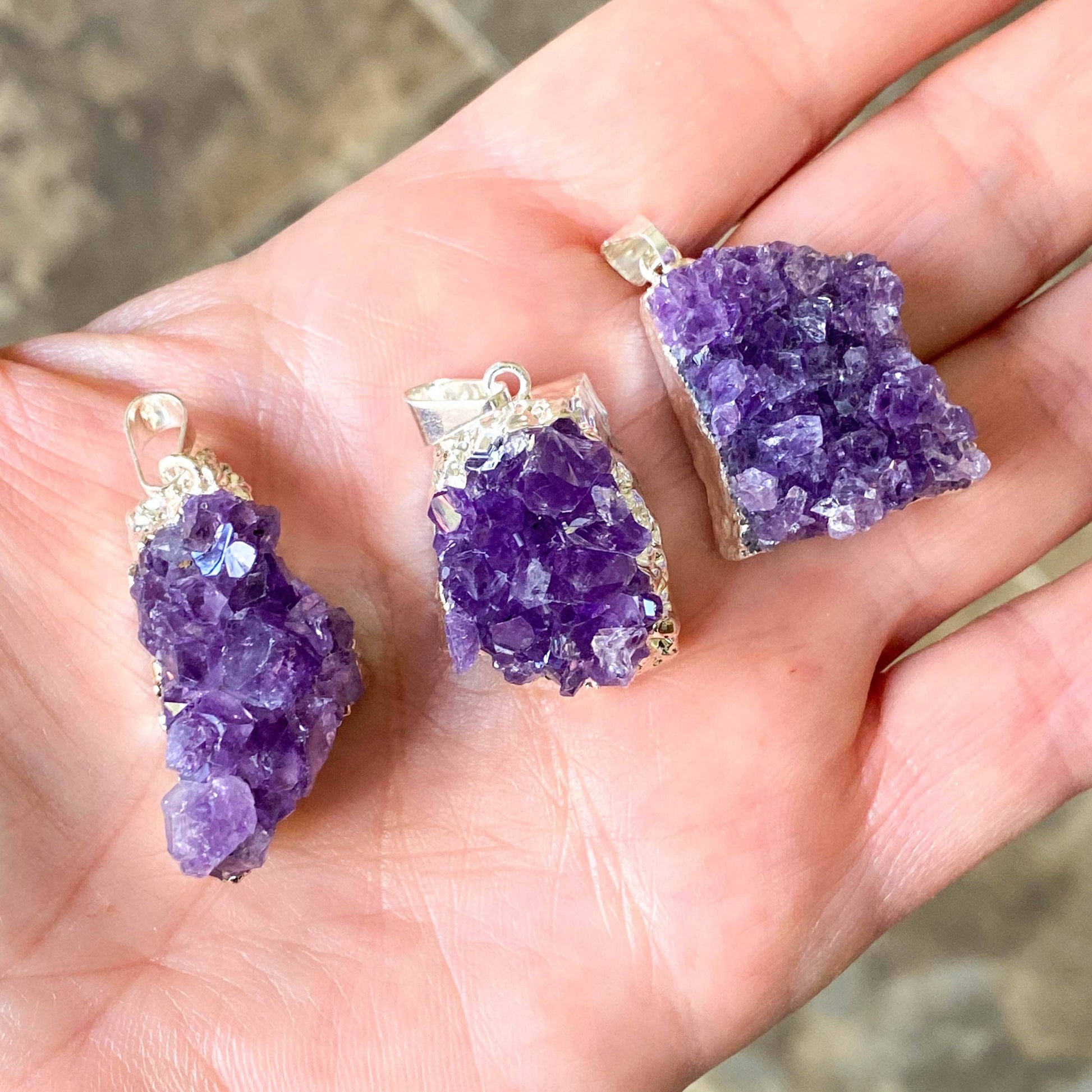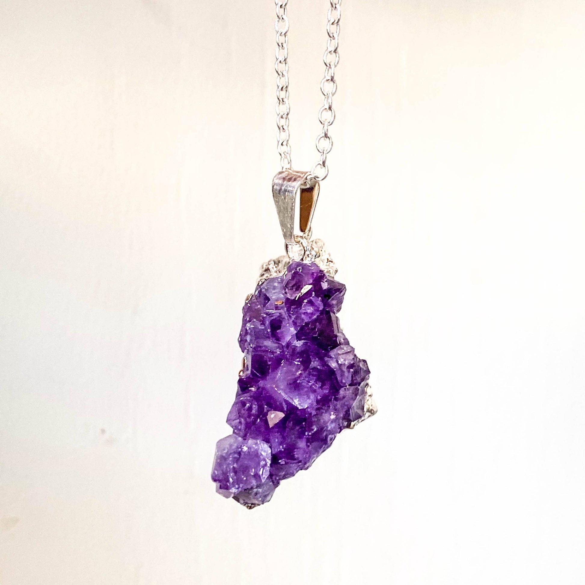 Healing crystal necklace made with a beautiful amethyst cluster with silver plated electroformed sides. Comes on your choice of 16" to 24" silver plated chain.