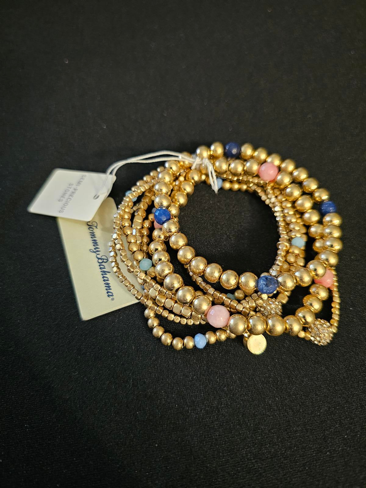 Elevate your accessory collection with this stunning set of stretch bracelets by Tommy Bahama. Featuring a beautiful combination of golden beads and semi-precious stones in shades of pink, blue, and more, these bracelets are perfect for layering or wearing alone. The soft stretch allows for easy on-and-off while providing a comfortable fit. Ideal for both casual and dressy occasions, this versatile set will add a touch of elegance to any outfit.